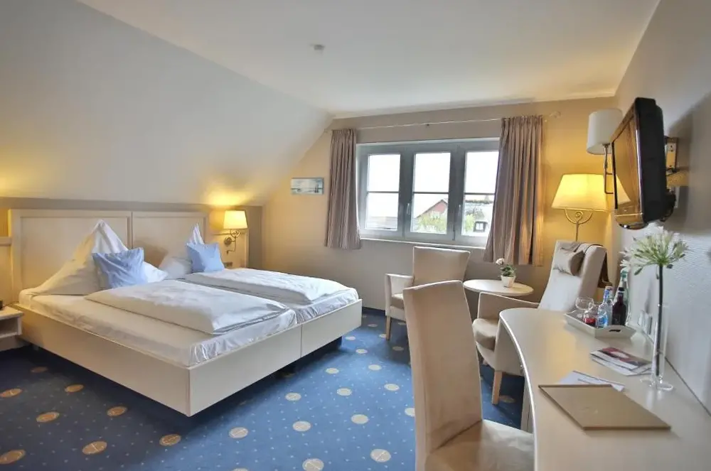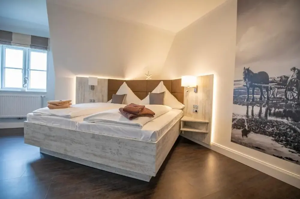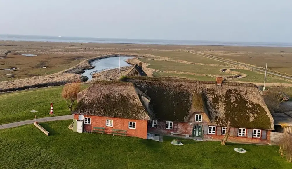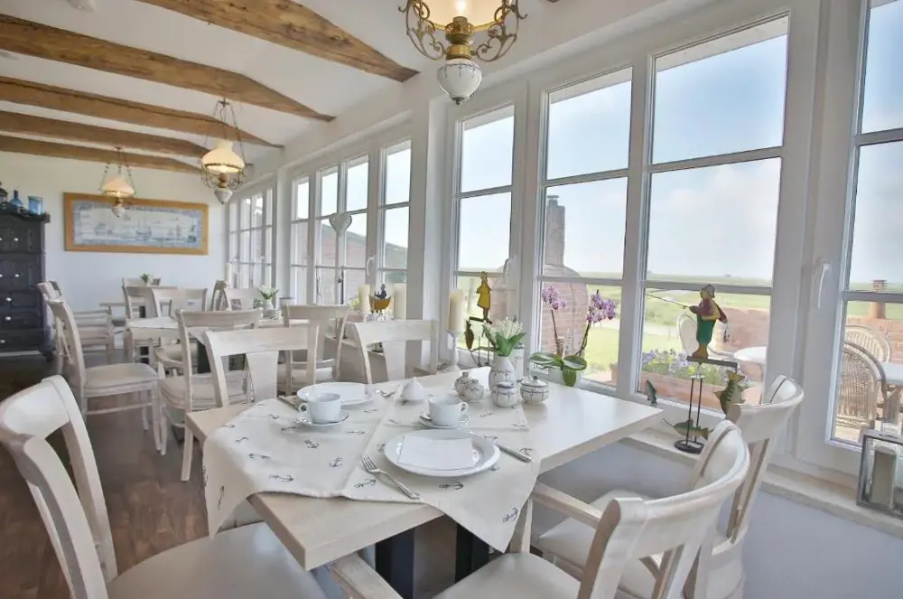 Mere information om Kapitänshaus MeerblickAnker's Hörn - Hotel & Restaurant auf der Hallig Langeness er et 4-stjernede hotel beliggende på Vesterhavs Halligen-øen Langeneß. Hotellen tilbyder værelser i moderne frisisk stil samt en sauna med panoramaudsigt. Alle værelser inkluderer WiFi, fladskærms-TV med satellitkanaler og minibar. De private badeværelser har makeup-spejl og hårtørrer, mens flere værelser giver udsigt over Vesterhavet.