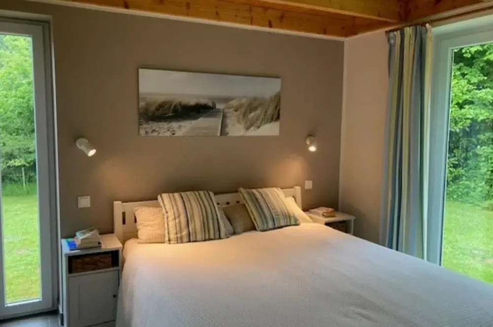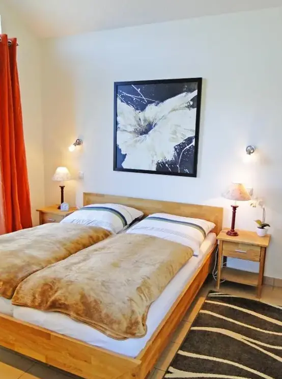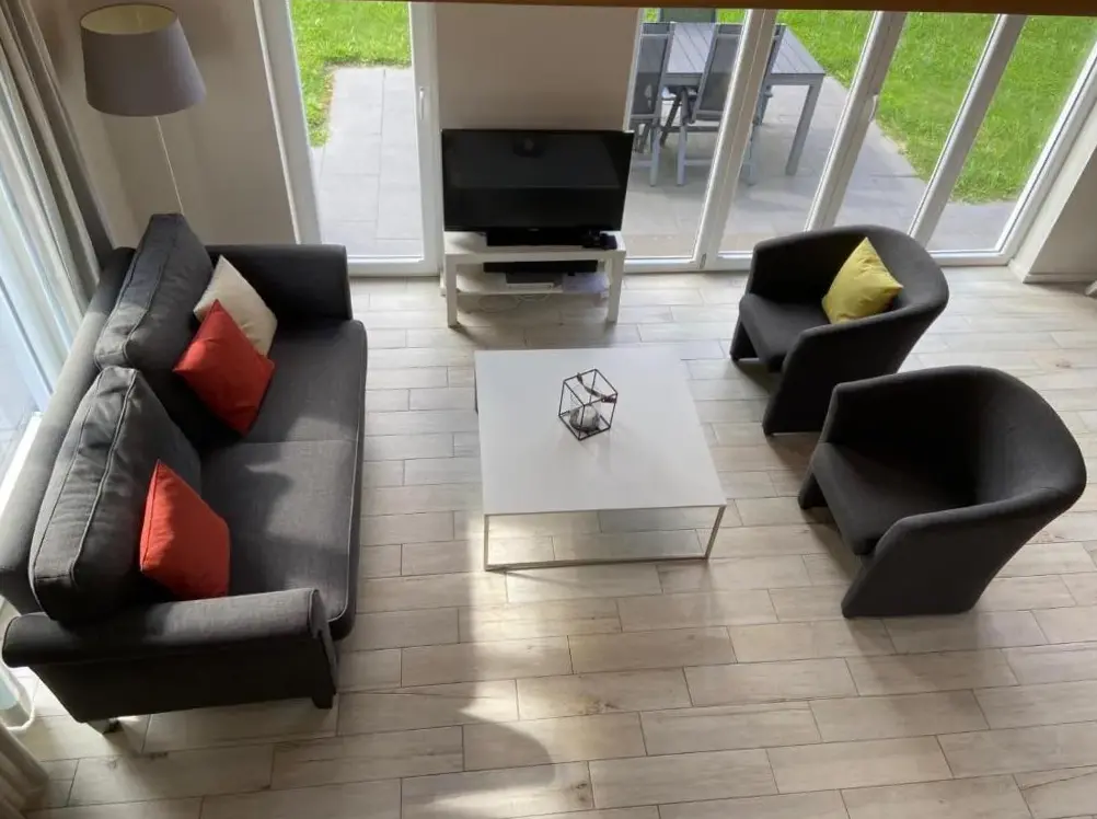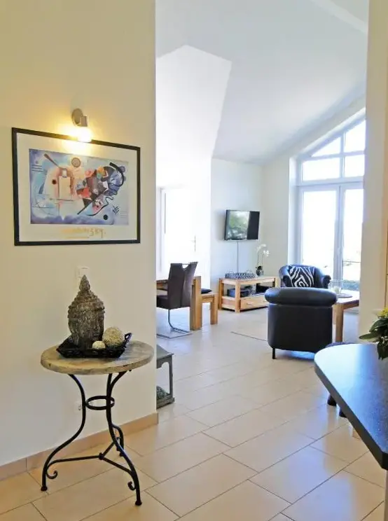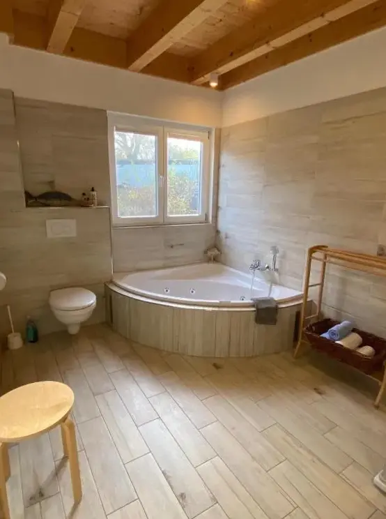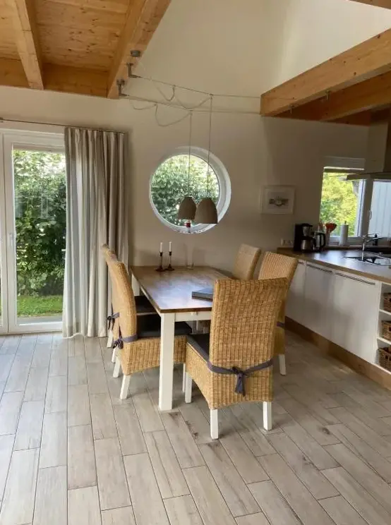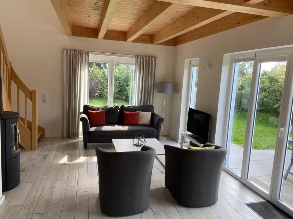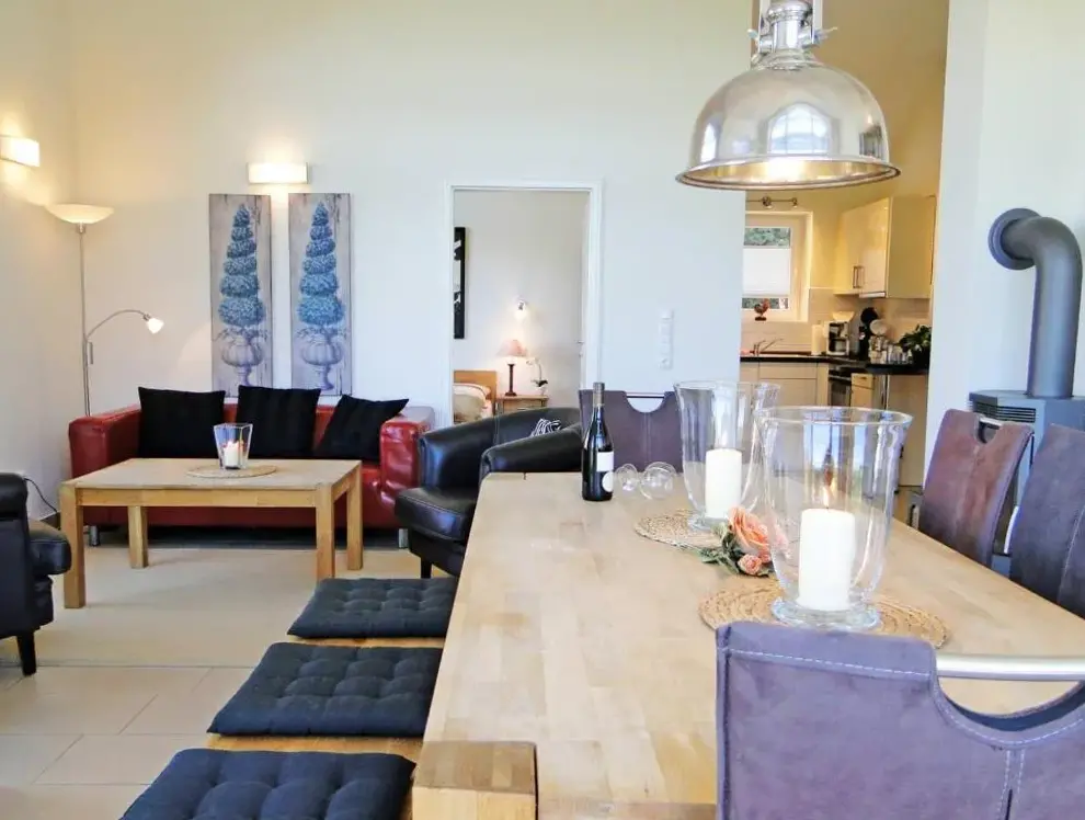Kieholm is a holiday home located in Bohnert, Germany, offering comfortable accommodations with two bedrooms and two bathrooms. The living room features a cozy fireplace and a dining area, while guests can relax using the sauna, hot tub, and terrace. Additional facilities include a lounge, outdoor seating area, and family rooms. Free WiFi is available throughout the property.