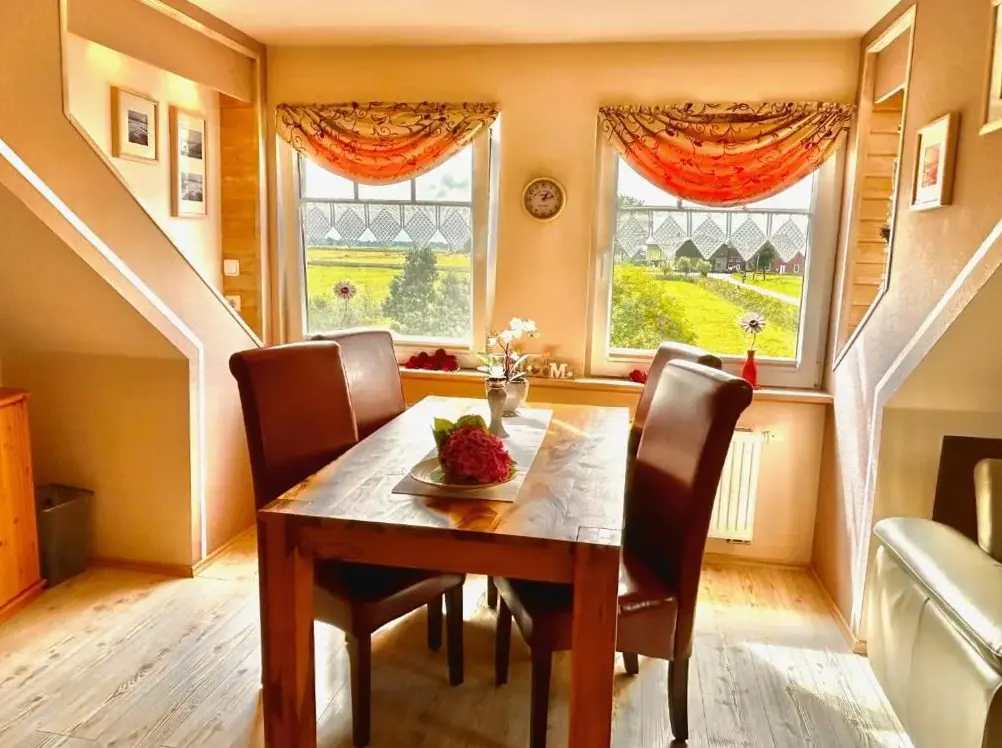 More information about Ferienwohnung Sky ViewFerienwohnung-Treeneblick in Schwabstedt provides a beachfront retreat with direct access to the shoreline, featuring a sun terrace and expansive garden. The accommodations offer one bedroom, a living area, and a fully equipped kitchenette.