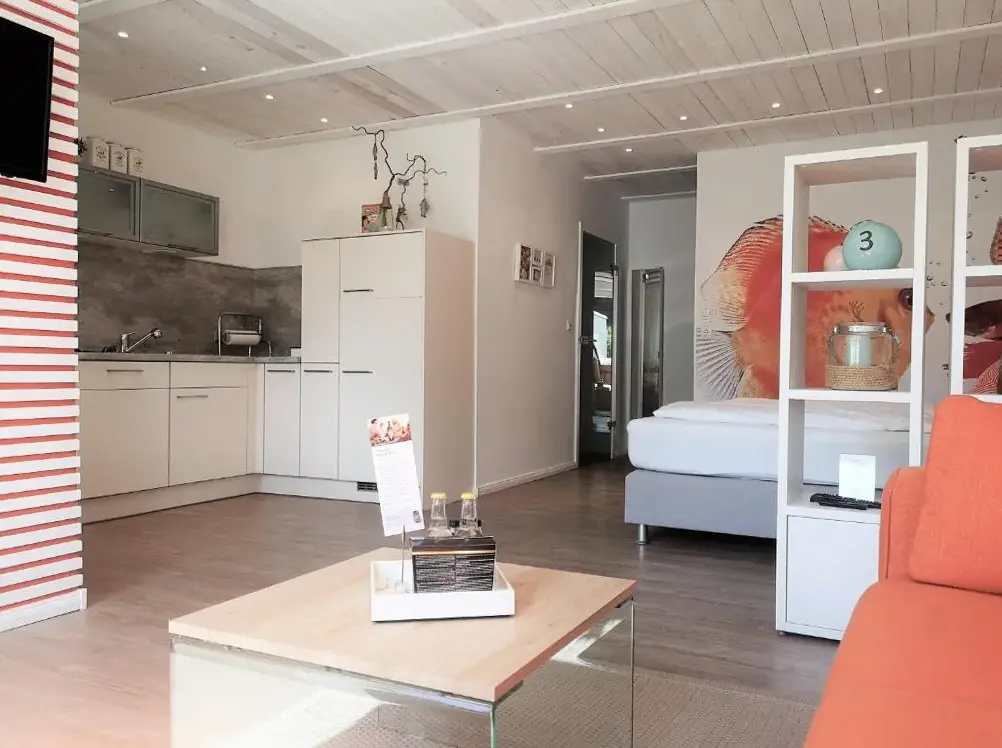 More information about Wohnen&Wellness KurgartenstrasseTraumwohnung Sonja in Schuby provides a comfortable stay with a spacious apartment featuring one bedroom and a living room. The ground-floor unit includes a terrace offering garden views and a private entrance. Modern amenities such as free WiFi, a fitness center, sun terrace, and garden enhance the guest experience. The kitchenette is equipped with a coffee machine, dishwasher, and oven.