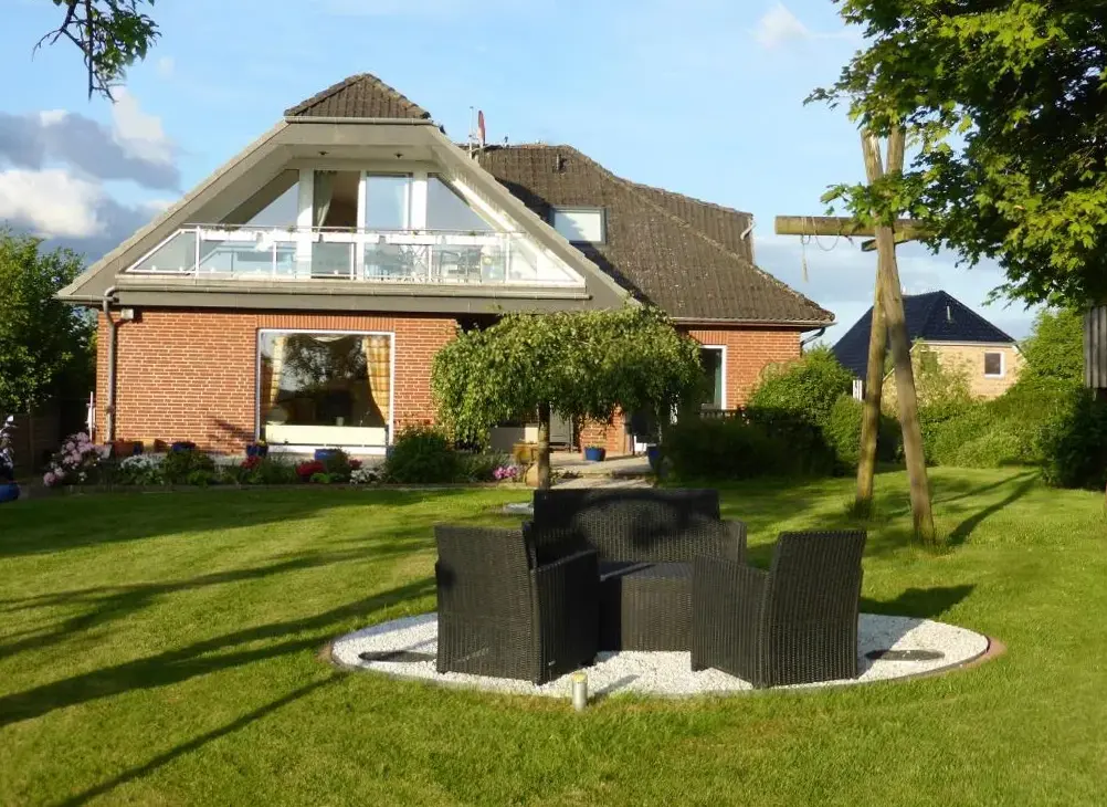 Mais Informações sobre Hotel WindschurO Haus Theda em Fockbek é um chalé espaçoso com dois quartos e uma sala de estar, ideal para quem busca conforto e tranquilidade. Oferece um terraço ao sol, jardim e conexão Wi-Fi gratuita em toda a propriedade. Comodidades incluem check-in e check-out privativos, lareira ao ar livre e recepção 24 horas.